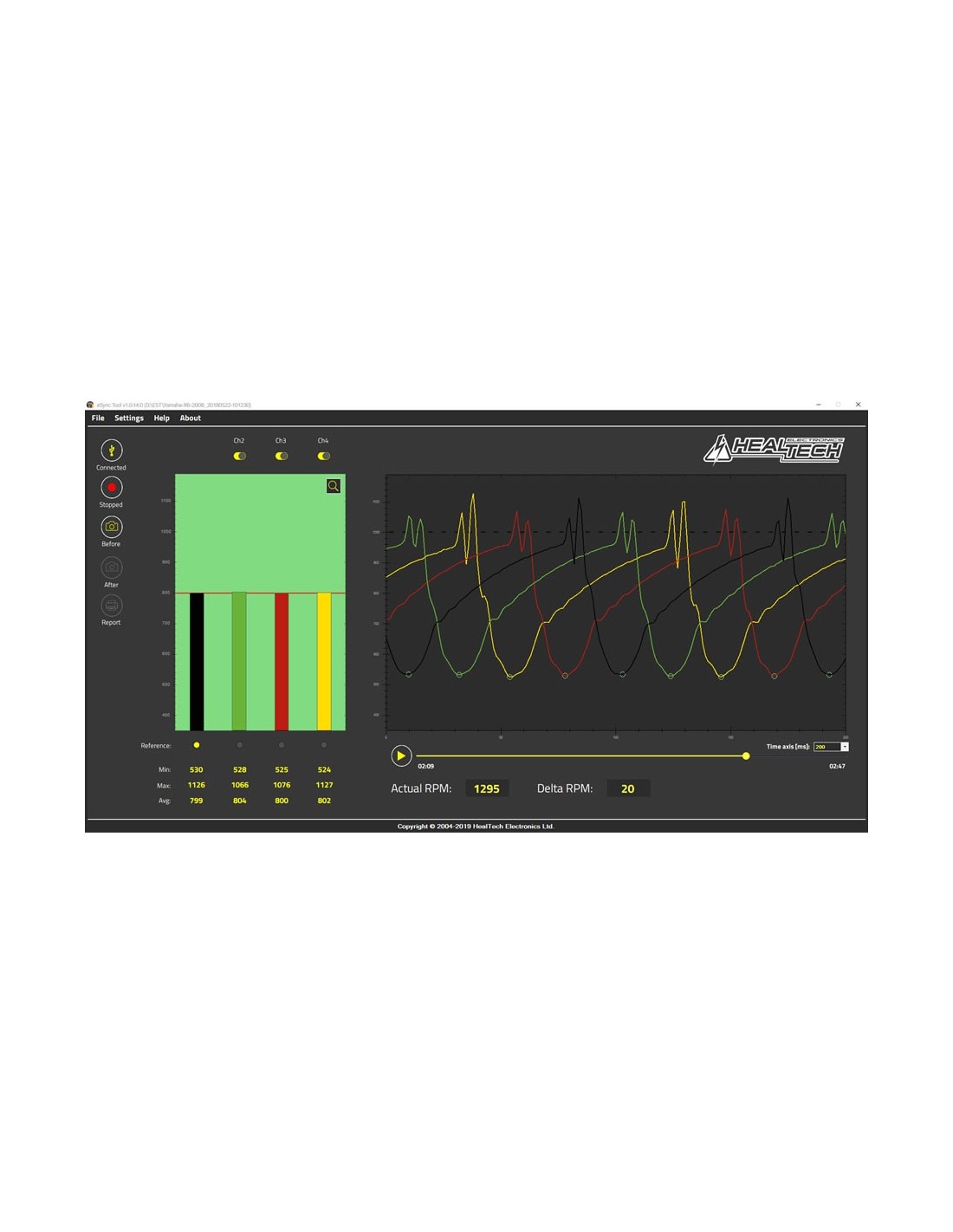 The Healtech eSync has four measurement channels and not only provides accurate measurements, but can also display the pulse/vacuum waveform on each cylinder for troubleshooting complicated problems.