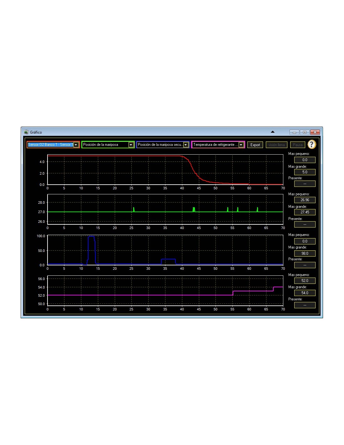The software has a graphical view where the values of any sensor can be plotted and recorded in real time. It is possible to archive the recording and play it back.