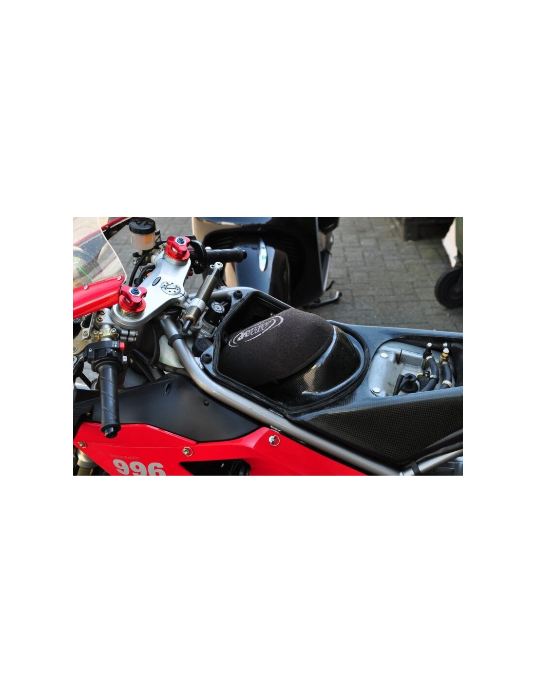 MWR Performance air filter for 748Bip./S/SP/SPS, 916Bip./S/SP/SPS and 996Bip. & S models. Remove the filter inside the air tubes and also the protective mesh in front of the air tubes to experience the true Ram-Air system of this motorcycle. Place the filter over the Velocity Stacks, make sure the foam material is in the same place as the stacks. The filter cage allows the filter material to be sucked into the inlets, see photo.