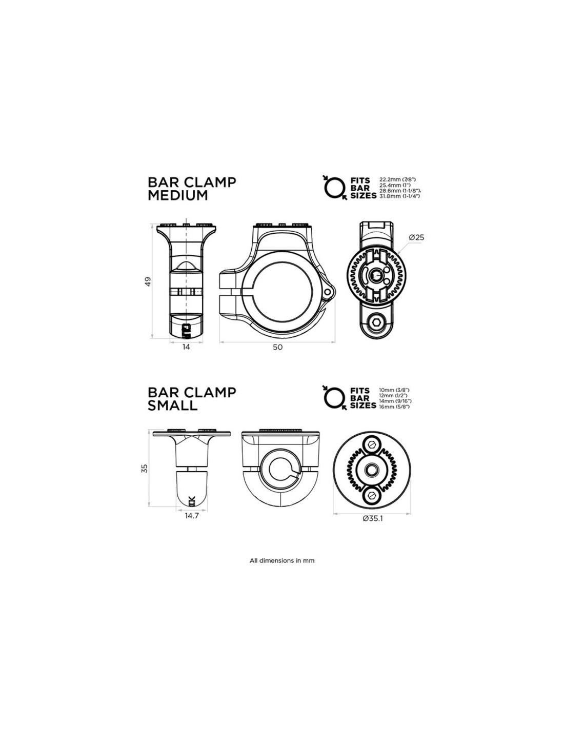 Fits bars with 10mm (3/8"), 12mm (1/2"), 14mm (9/16"), and 16mm (5/8") diameters