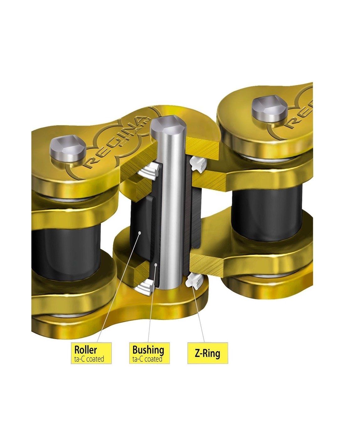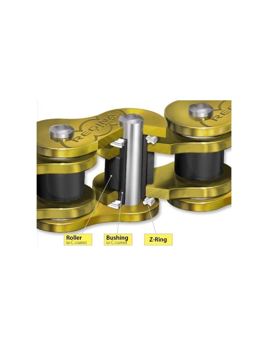 The Regina 525 HPE 120 pitch 137HPE/1007 chain is the first maintenance-free chain. The tetrahedral amorphous carbon coating applied to the bushes and rollers offers high levels of hardness with a low coefficient of friction in the chain drive. It eliminates lubricant splash during operation, minimising environmental impact.