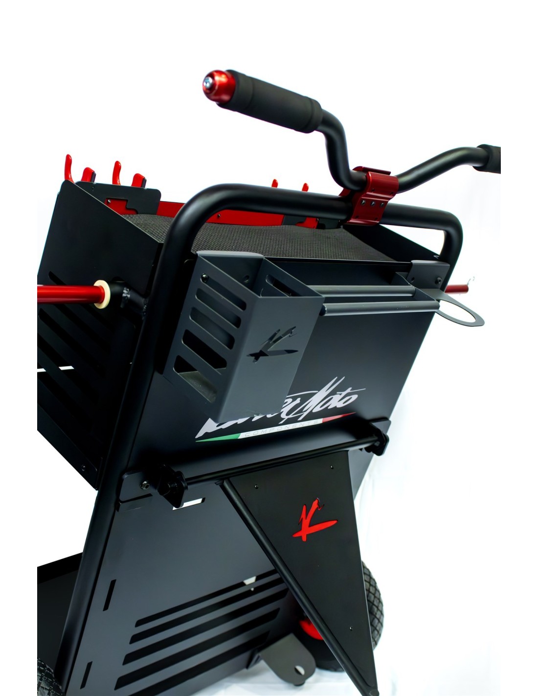 It also includes a bottle holder for the rider, an umbrella holder, and a red anodized wheel support.