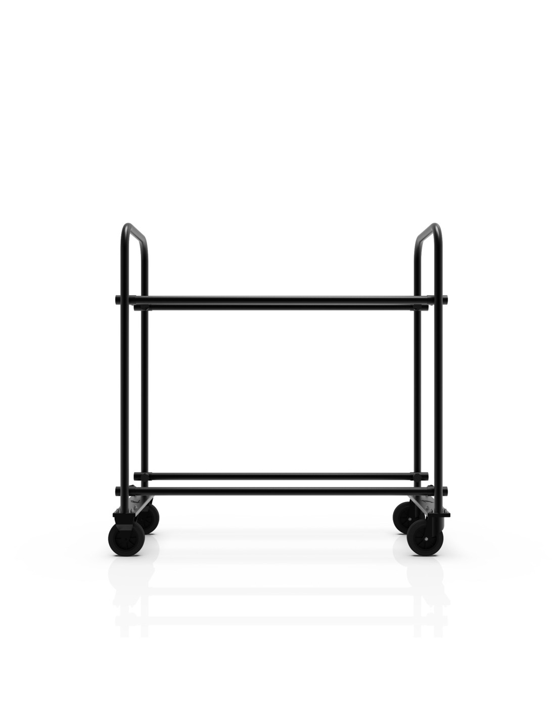 The cart is made with a hand-welded steel tube frame and is equipped with four large-diameter swivel rubber wheels.