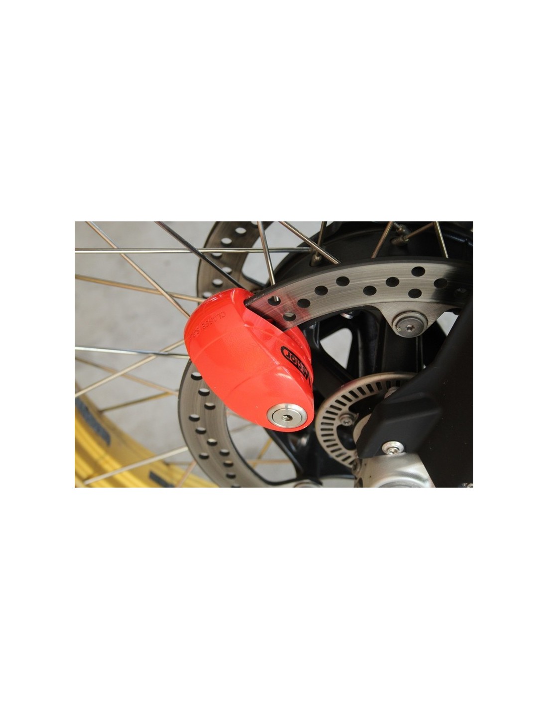 Monoblock disc lock with 120 dB alarm system.