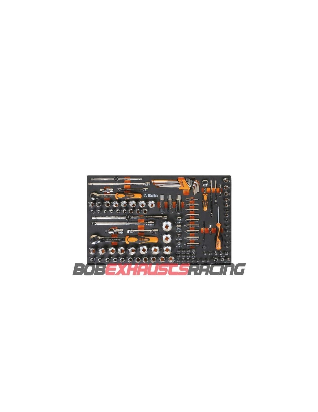 Soft thermoformed tray with tool assortment : hexagon hand sockets, long series 5-6-7-8-9-10-11-12-13 mm ball head offset hexagon key wrenches 1,5-2-2,5-3-4-5-6-8-10 mm 3 socket holders 1/4" socket drivers for hexagon screws 3-4-5-6-7 mm socket drivers for slotted head screws 0,8x4-1x5,5-1,2x6,5-,2x8 mm socket drivers for cross head Phillips screws PH1-PH2-PH3-PH4 socket drivers for Torx head screws T10-T15-T20-T25-T27-T30-T40 adaptor, 1/4” female and 3/8” male drives 1/4 - 3/8 1/4” drive extension bar 50-100-150 mm 1/4" drive universal joint 1/4" drive spinner handle 1/4" drive swivel T-handle 1/4" reversible ratchet hexagon hand sockets 3/8" 6-7-8-9-10-11-12-13-14-15-16-17-18-19-20-21-22 mm adaptor, 3/8” female and 1/4” male drivers 3/8 - 1/4 adaptor, 1/2" female and 3/8" male drives 3/8 - 1/2 extension bar - 3/8" 125 mm extension bar - 3/8" 250 mm 3/8" drive universal joint 3/8" drive sliding T-handle 3/8" drive reversible ratchet 1/2" square drive hexagon sockets 8-10-11-12-13-14-15-16-17-18-19-20-21-22-23-24-26-27-28-30-32 mm 70mm drawer 588 X 367mm adaptor, 1/2” female and 3/8” male drives 1/2 - 3/8 1/2" drive universal joint 1/2” wobble extension bar 125 - 250 mm 1/2" drive sliding T-handle 1/2" drive reversible ratchet 3/8" square drive spark plug sockets 16-17,8-20,8 mm 367 X 588mm