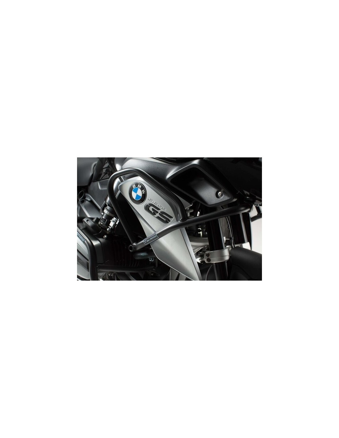 The upper engine guards, made of black powder-coated aluminum, can be mounted to complement the SW-MOTECH side crash bars.