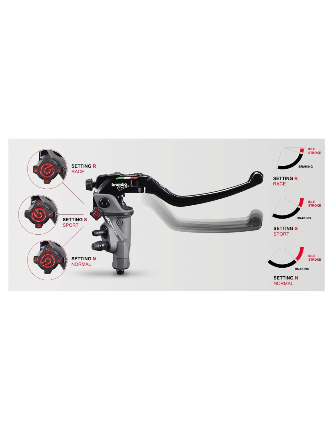 The most significant new feature of the 17RCS CORSA CORTA is that it offers the rider the possibility of adapting the position of the braking attack point, "bite point", to his riding preferences, by means of an easily accessible selector located on the top of the pump.