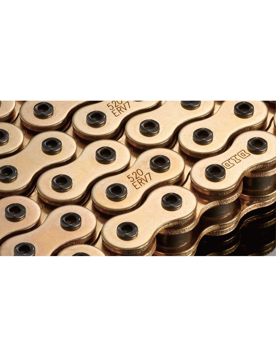 DID 520 ERV3 chain 520 chain Use in competition 120 links Very light Low friction X seal Super-reinforced Black and golden For road and speed 3920kgs traction resistance Rivet link Used in Yamaha MotoGP