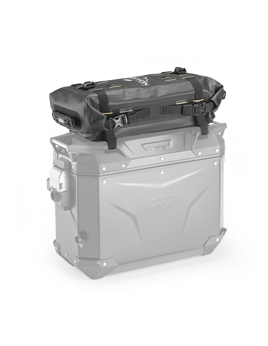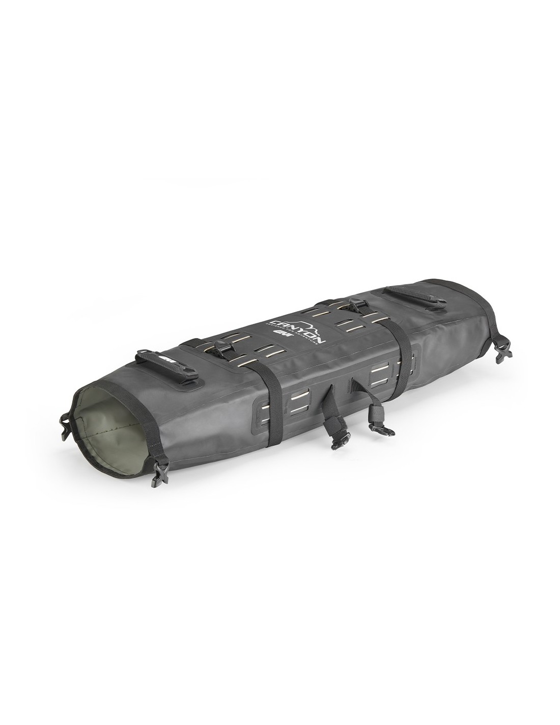The bag can be used to add extra cargo space by attaching it to the saddle or aluminum pannier lids. Thanks to its comfortable straps and MOLLE system, it can also be installed in combination with other models in the Canyon range, such as the GRT726 cargo bag, allowing you to expand your luggage layout and adapt it to the longest and most demanding trips.