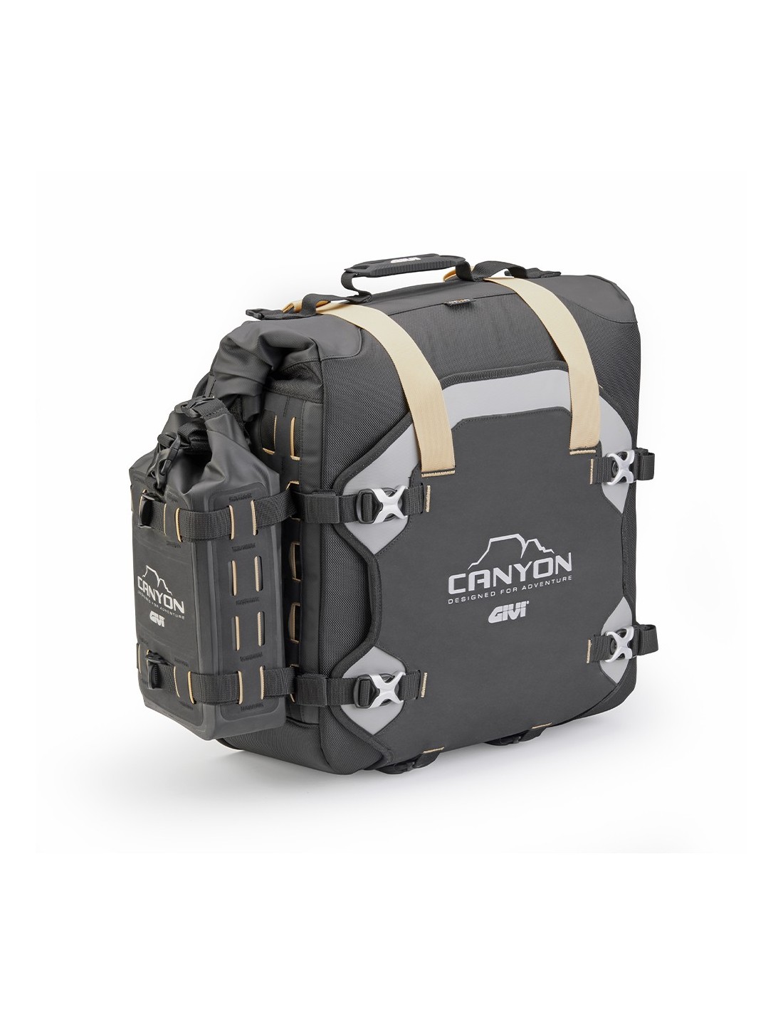 The MOLLE system side loops on the sides of the bags allow for the addition of extra items, allowing the load to be combined with other models in the Canyon range, such as the small GRT730 bag, for storing tools, first aid kits, or two canteens.