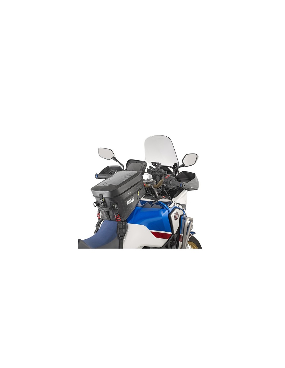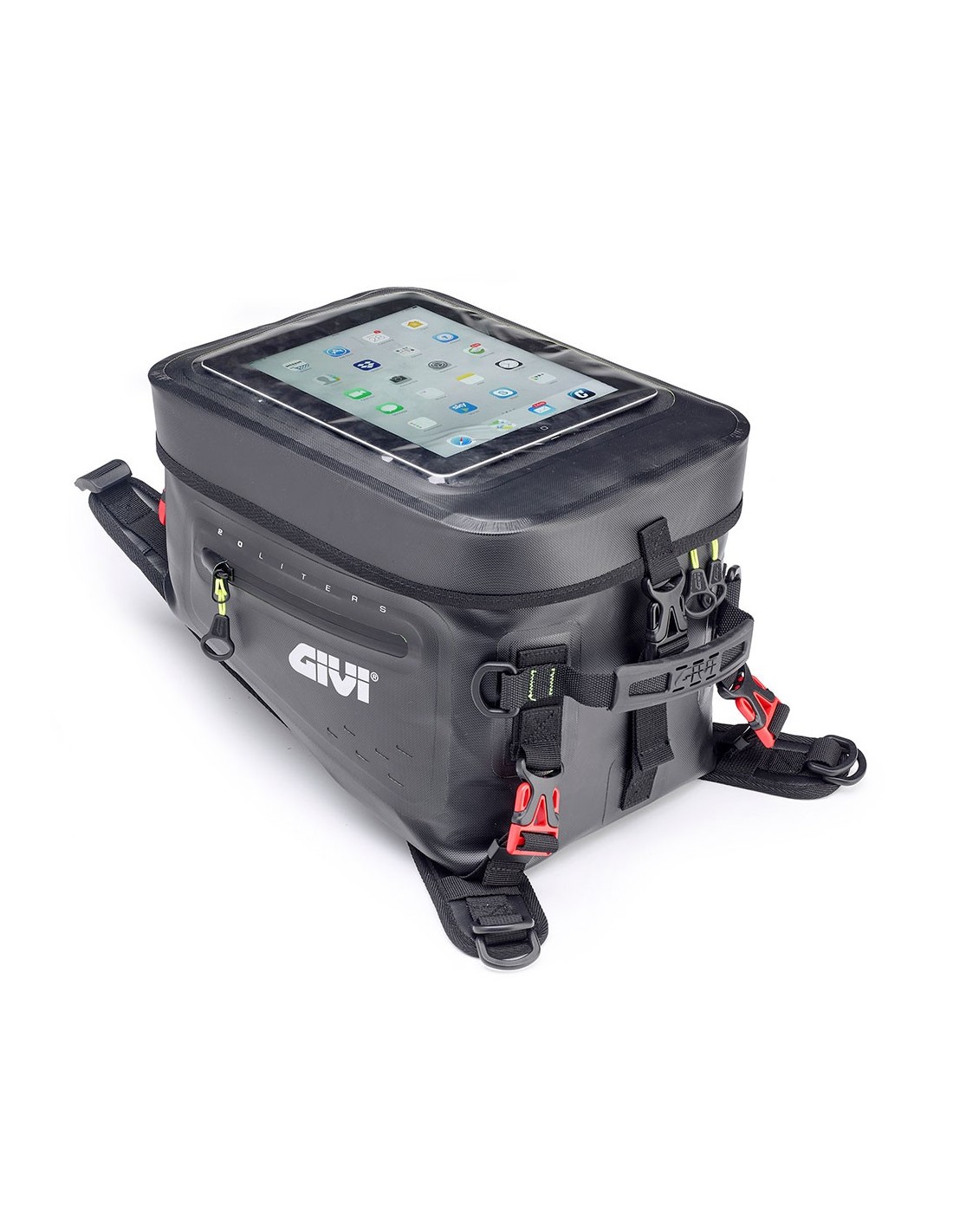 Black, 20-liter waterproof tank bag with yellow interior. Equipped with a dedicated base for quick attachment/detachment.