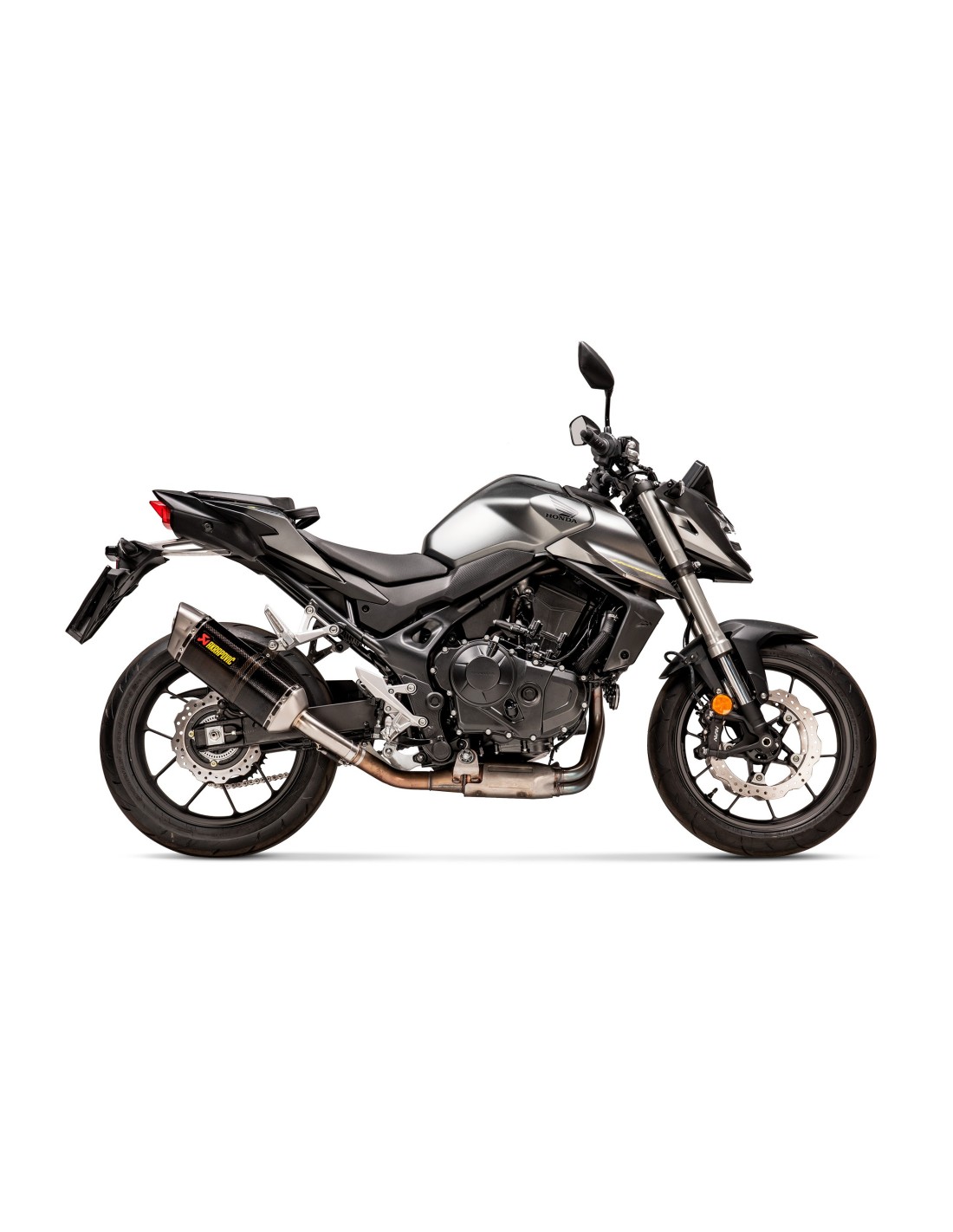 Weight is reduced by 45.6% (1.8 kg) compared to the standard exhaust. Power and torque gains are observed, especially in the mid-to-high rev range, with increases of 0.5 kW (0.7 hp) at 5250 rpm and 0.6 Nm at 5300 rpm, respectively, compared to a Honda CB750 Hornet equipped with a standard system and tested on Akrapovič's internal dynamometer. This is a fully CE/ECE Euro 5 compliant system that requires no reprogramming, just a plug-and-play installation. It delivers a deep, sporty, and vibrant Akrapovič sound and is fully compatible with Honda's original soft cases.