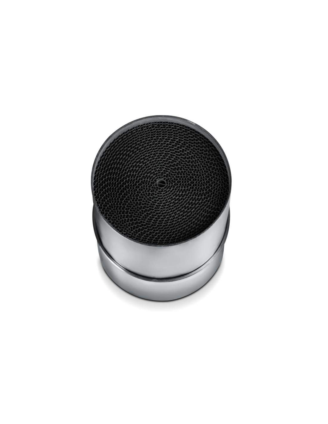 The catalytic converter is a honeycomb-shaped metal structure incorporating precious metals (palladium, rhodium, and platinum) on its surface.