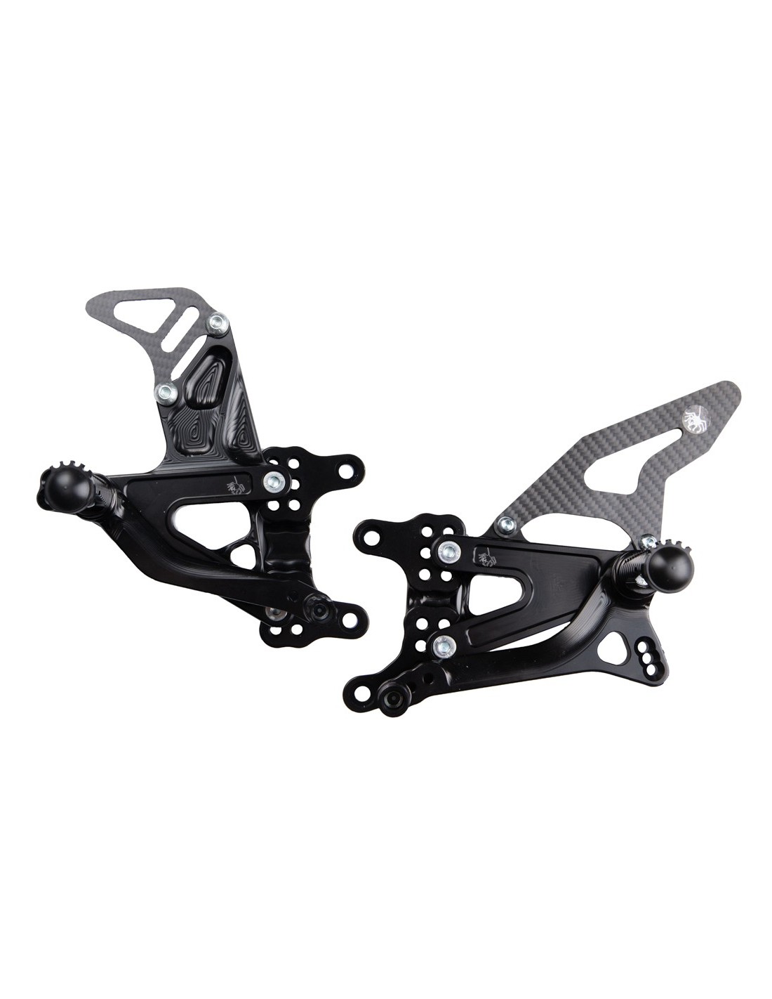 Retarded and adjustable. Features: Made of ergal 7075. Valid for normal and inverted gear. Available with fixed footrest. Screws included in the kit. Easily adjustable. Finished in black colour.
