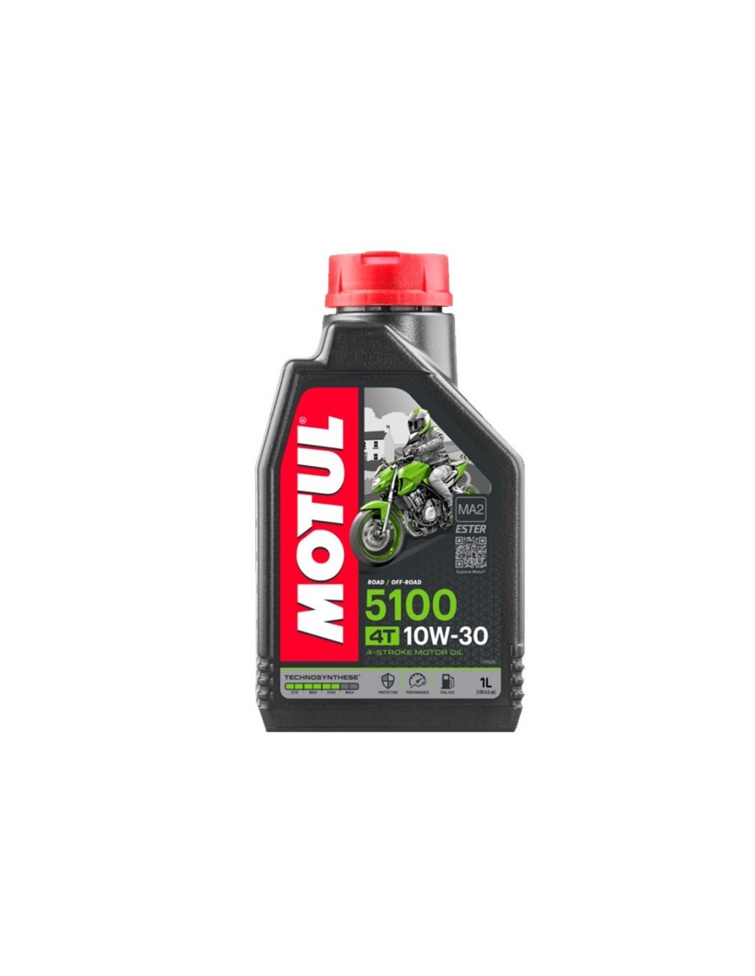 Motul semi-synthetic oil 5100 4S 10W30 1L High performance lubricant. Four-stroke engines. Technosynthèse - Ester For any kind of motorcycle (road, trail, offroad, trial...) with a four stroke engine approved by the anticontamination specifications Euro II or Euro III Technosynthèse lubricant, reinforced with Ester bases. Improves oil film's resistance to high temperatures
