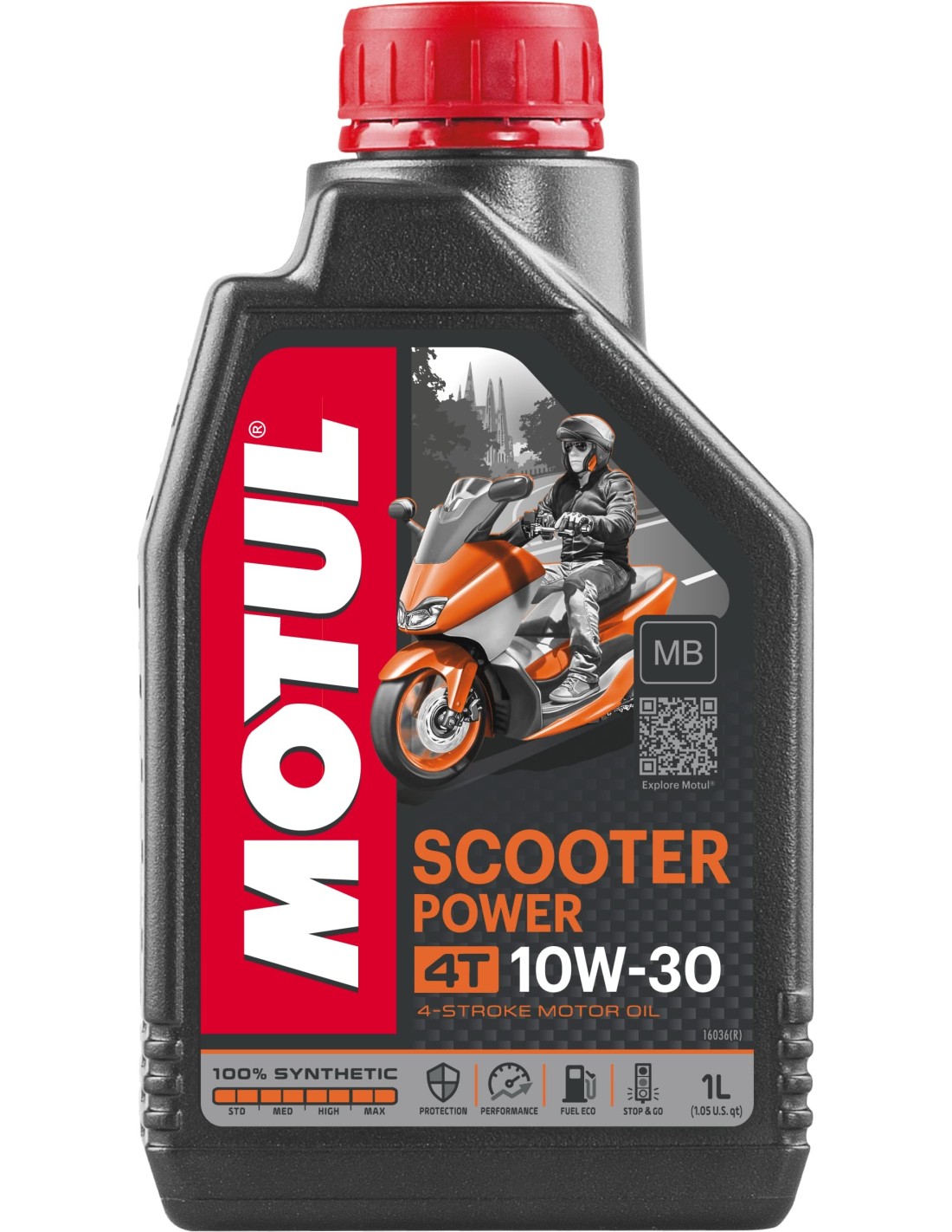 Motul Scooter Power oil 4S 10W30 MB 1L Lubricant oil 100 synthetic specially designed for four-stroke engines of scooters and maxi scooters. From 49cc to 650cc.
