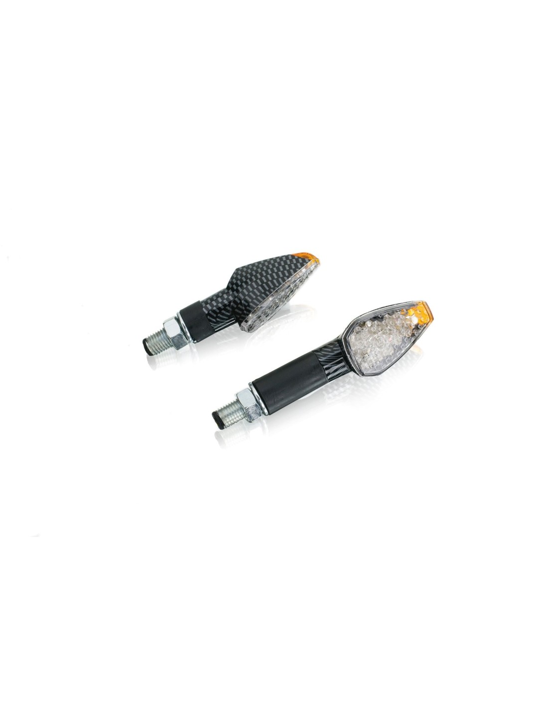 Set of approved LED turn signals with housing available in black or carbon-look and clear glass, available in two sizes: Short Arm (66x27mm) and Long Arm (86x27mm). Flashing function.