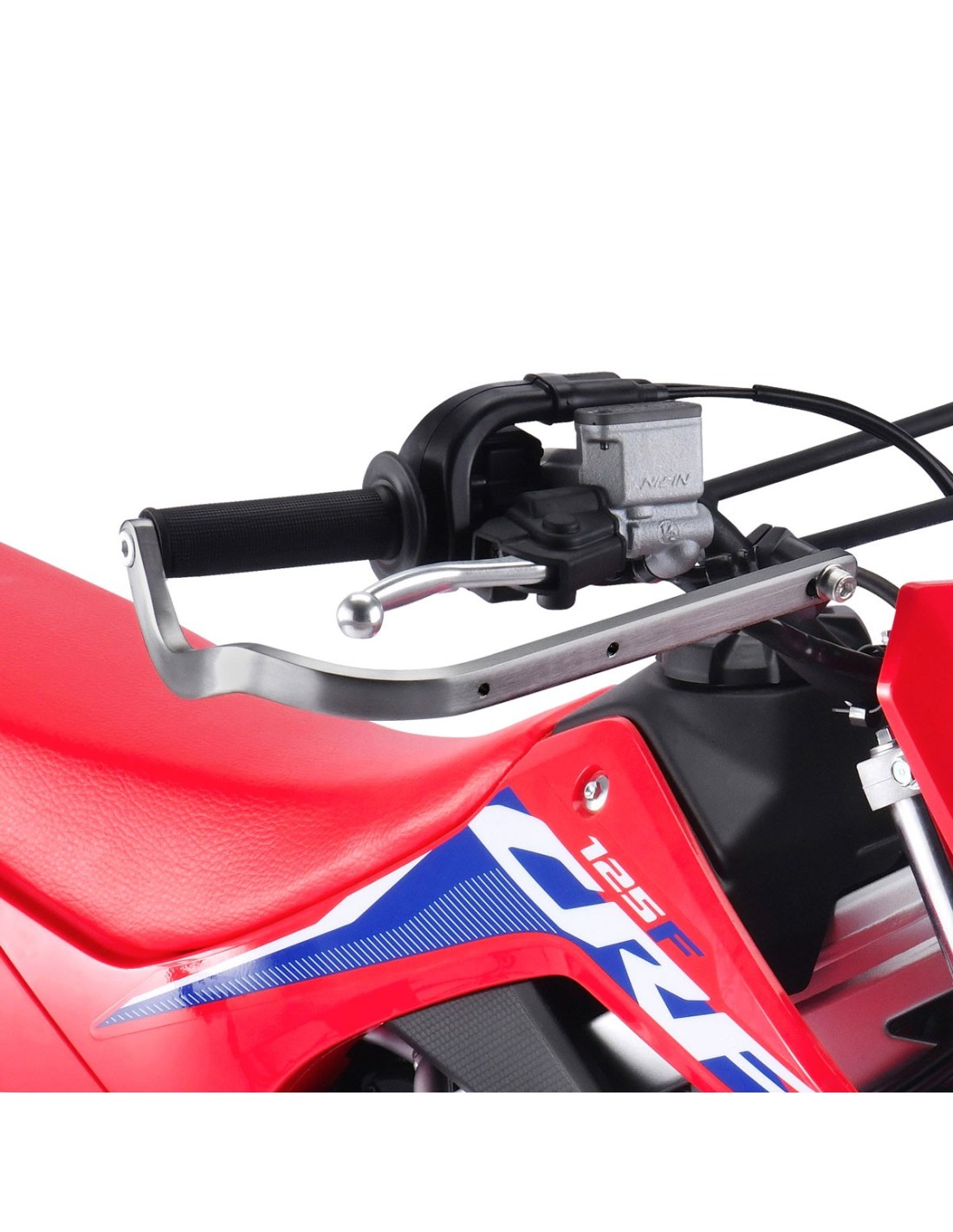 Armor hand guard specifically designed for CRF125F and other 4-stroke mini handlebars. Special shaped hand guard and U-clamp included to fit handlebars with shorter handlebar width and larger rise.